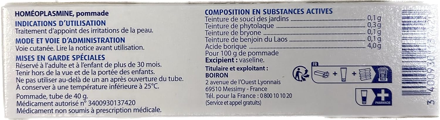 Homeoplasmine by Boiron is a versatile homeopathic ointment designed to relieve skin irritation, dryness, and redness. Widely used in French pharmacies, this cult-favorite balm helps soothe minor cuts, chapped lips, razor burn, and windburn. Formulated with plant-based extracts and antiseptic ingredients, it offers gentle yet effective relief for everyday skin concerns. Ideal for use on dry patches, irritated skin, or as a nourishing balm in cold weather. Comes in a convenient 40g aluminum tube.