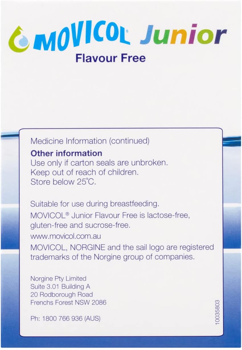 MOVICOL Junior Flavour-Free (30 Sachets) provides gentle and effective relief from occasional or chronic constipation in children. Specially formulated for pediatric use, this unflavored powder for oral solution is easy to mix with water or any non-carbonated drink. Powered by macrogol 3350 and essential electrolytes, MOVICOL Junior works with your child's body to restore comfortable, regular bowel movements without harsh side effects.